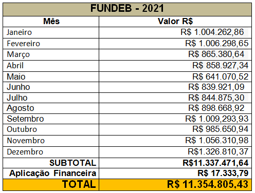 do FUNDEB com os rendimentos sobre aplicação financeira R$ 11.354.805,43 (ONZE MILHÕES, TREZENTOS E CINQUENTA E QUATRO MIL,